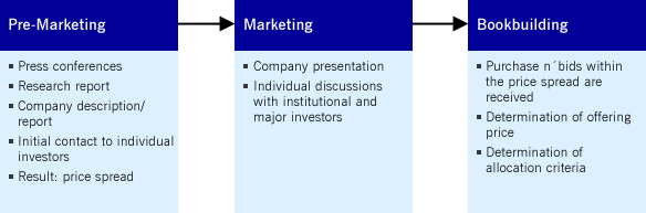 For the classic book building procedure company and banking syndicate will jointly agree on a price spread prior to the start of the offer period. This spread will be ascertained in advance by the syndicate members based upon the due diligence performed in combination with a targeted investors’ survey. In the course of such survey, the banks inquire the interest of potential investors in the stock by asking, for instance, for non-binding purchase bids. Prior to the start of the actual offering stage, a price spread will be determined and published accompanied by any other Information regarding the securities offered.