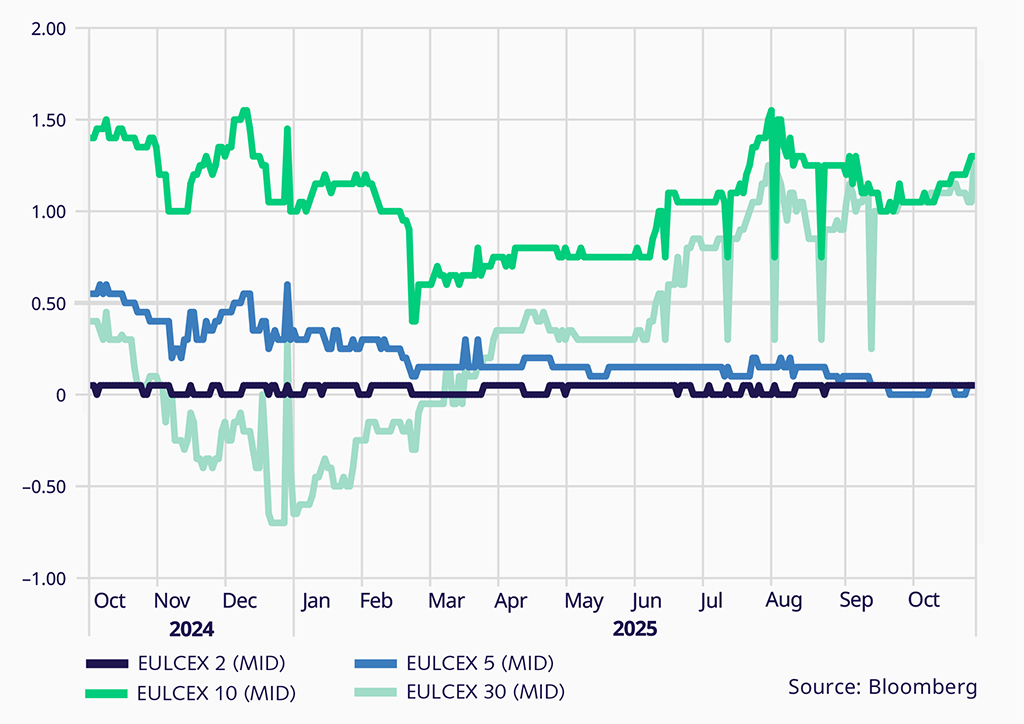 1 Due to tri-party multilateral portfolio compression, new trades have been opened at Eurex Clearing AG, resulting in total of 142bn Euro in October 2024, 123bn Euro in November 2024, 244bn Euro in December 2024, 131bn Euro in January 2025, 197bn Euro in March 2025, 191bn Euro in May 2025, 138bn Euro in June 2025, 211bn Euro in August and 207bn Euro in September 2025.