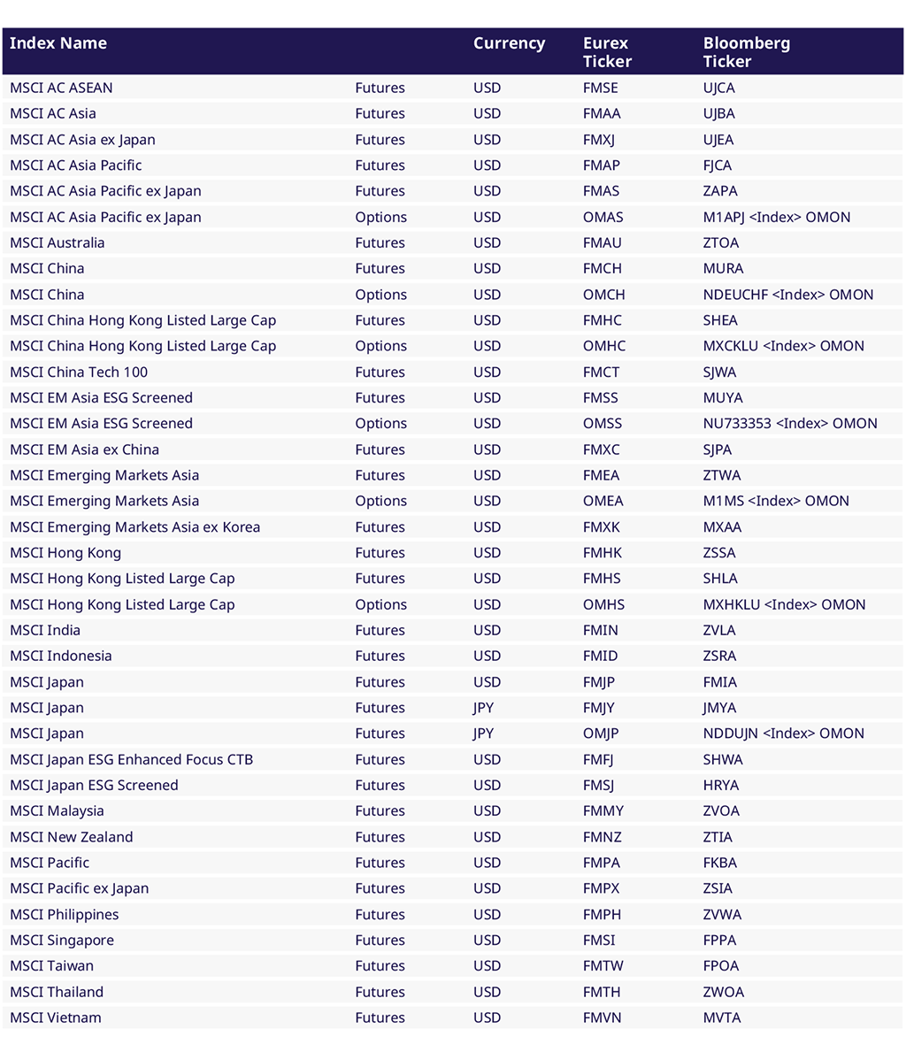 现在投资者可以通过Eurex的MSCI股指衍生品来对整个地区和单个国家进行投资。完整的可用产品组合涵盖了发达、新兴和前沿市场,幷涵盖了许多基于流行基准股指的有吸引力的合约,例如基于以下股指的期货和期权: