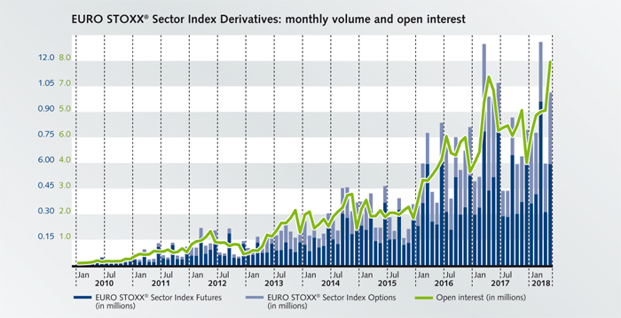 類股指衍生品是歐交所增長最快的細分市場之一。2017年,歐交所的類股指期貨和期權合約交易超過9000萬筆,這恰恰證明這些産品越來越受到歡迎。交易量同比增長25%。2017年,期貨和期權的日均交易量分別爲22.3萬和11.3萬份合約。2018年第一季度,交易量同比增長23%,幷且在2018年3月,歐元斯托克類股指期貨創下了960萬手交易量的記錄。2018年,歐元斯托克類股指期貨和期權交易額總計達4450萬歐元。