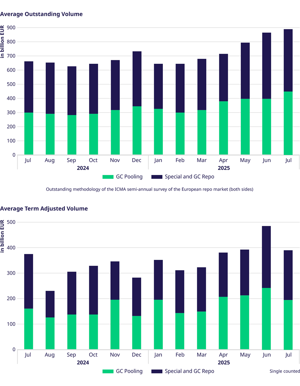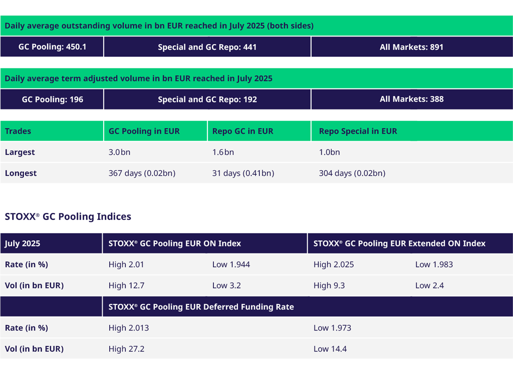 Outstanding volumes reached a new record high on 28 July 2025. When compared to July 2024, average outstanding volumes increased by 34 percent overall. GC Pooling volumes rose by 51 percent, and Repo volumes grew by 20 percent. Traded volumes also showed a modest increase, with a 2 percent rise overall. GC Pooling traded volumes were up by 8 percent, while Repo traded volumes declined by 5 percent.