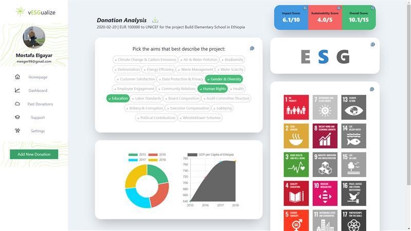 Mostafa: Unser Endprodukt "vESGualize" ermöglicht es dem Nutzer zu bewerten, welche SDGs durch Spenden beeinflusst werden, wie relevant sie sind und welchen relativen Einfluss sie im Kontext der kritischsten ökologischen und sozialen Bedürfnisse der Welt haben. Damit können Engagements mit positiver Wirkung wie Spenden zielgerichtet und am effektivsten platziert werden. Unser langfristiges Ziel ist es, Unternehmen bei der Gestaltung einer grüneren und sozial gerechteren Zukunft zu unterstützen.