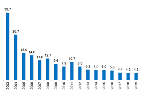 Das Xetra Liquiditätsmaß (durchschnittlicher Spread für eine Round-Trip-Order von €100k) der 20 liquidesten Aktien-ETFs auf Xetra lag in 2019 im Durchschnitt bei 4,2 Basispunkten.