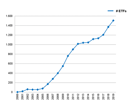 Seitdem nahmen Handel und Produkt-Innovation immer mehr Tempo auf. Allein 2019 wurden 183 neue ETFs gelistet. Damit notieren heute an Xetra mehr als 1.500 ETFs. Sie kommen auf einen durchschnittlichen monatlichen Handelsumsatz von elf Milliarden Euro und machen die Deutsche Börse auch damit zum führenden Börsenhandelsplatz in Europa, Marktanteil 28 Prozent. Am Ende des ersten Handelsjahres, im Dezember 2000, lag das ETF-Fondsvermögen im XTF-Segment bei 400 Millionen Euro. Bis Ende Dezember 2019 hat sich das ETF-Vermögen auf die Rekordmarke von 710 Milliarden Euro vervielfacht. Xetra liegt damit voll im Trend: Mehr als 100 Milliarden Euro frisches Geld floss 2019 in europäische ETFs. Das war der höchste Jahreszuwachs seit dem Start des Geschäfts im Jahr 2000. Insgesamt stecken in europäischen ETFs nun rund eine Billion Euro.