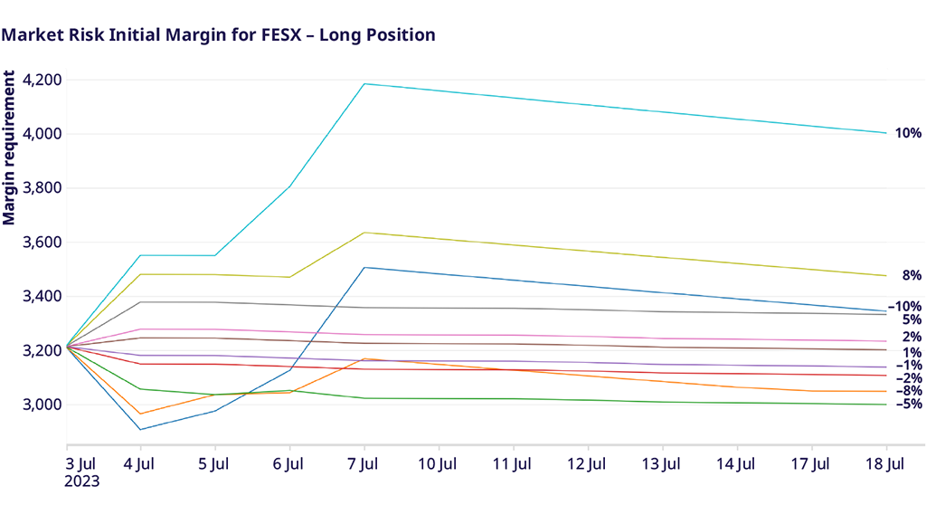 In line with the structure presented so far for the other disclosures, the Excel file Product_margin_response_disclosure_Q2_2023.xlsx provides the simulated margin requirements for each respective product under the various market shocks. Plots such as Figure 3 accompany the disclosed data and illustrate graphically the potential changes in margin requirements.