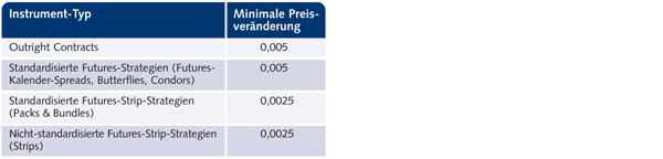 Die Preisermittlung erfolgt in Prozent auf vier Nachkommastellen auf der Basis 100 abzüglich gehandeltem Zinssatz. Die minimale Preisveränderung beträgt 0,0025 Punkte; dies entspricht einem Wert von EUR 6,25. Die minimale Preisveränderung in den verschiedenen Instrumenten des Kontraktes beträgt: