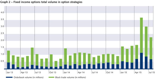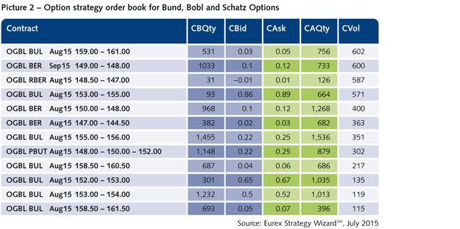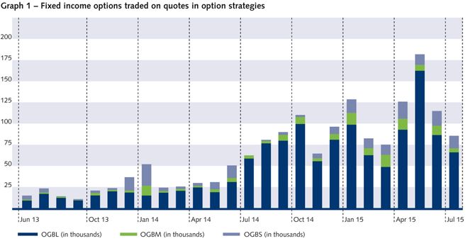 Bisher wurden 2015 im Tagesdurchschnitt zirka 5.000 Fixed Income-Optionskontrakte gegen Market Maker-Quotierungen in Optionsstrategien gehandelt. Wie beim Handel von Outright Calls und Puts gehört der Mid-Market-Handel mit Limit-Orders auch bei Optionsstrategien zur gängigen Praxis. Seit Ende 2013 hat sich nach Einführung des Market Making-Programms das Strategie-Volumen aufgrund der gesteigerten Eingabe von Block Trades sowie höherer Screen-Volumina erhöht.