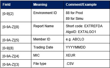 Please note that Trading Participants of Eurex Deutschland have to upload files for the operating MIC “XEUR”. Moreover, if a Eurex Trading Participant has multiple memberIDs, one file can cover short codes or algoIDs of all memberIDs.