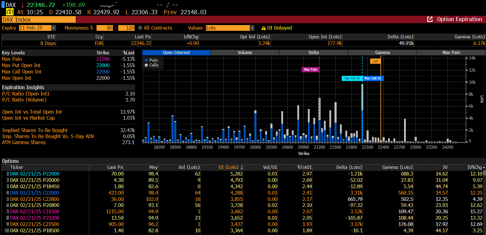 21 Feb expiry represents 13.97% of total open interest in DAX® Options. The most bullish position is 4,288 call options placed at the 22,000 strike. Put/call ratio stands at 2.10.