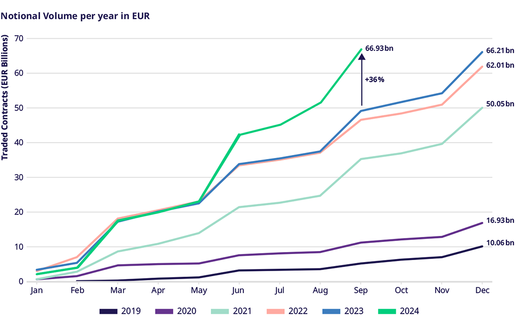 The Eurex ESG Index Derivatives segment continued its strong development in Q3 2024, already reaching the Notional Volume figures of the FY 2023 in September 2024.
