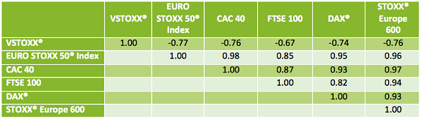 在過去的文章中,我討論了VSTOXX®波動率指數和EURO STOXX 50®指數之間的負相關關係。當股票下跌時(波動率下降)波動率指數趨於上漲的趨勢。