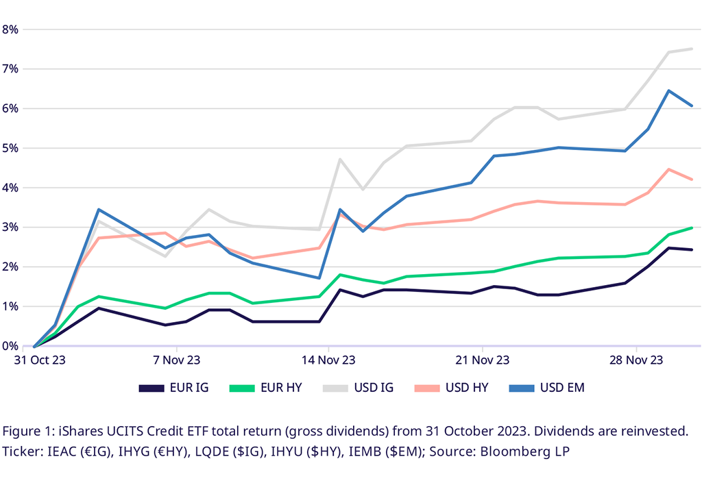 Long duration bonds were supported by bull-flattening curves, propelling the $-Investment grade corporate bond UCITS ETF (LQDE) to gains of 7.5% over the month, followed by $EM Sovereign Credit (IEMB, +6.1%) and $-High Yield (IHYU, +4.2%). In the Eurozone, a similar narrative of tightening measures having limited impact was supported by aggregated CPI stabilizing in October, with GDP slightly rising 0.1% and PMI data showing contraction but improving from the previous reading. €IG (IEAC, +2.4%) underperformed vs €HY (IHYG, +3%).
